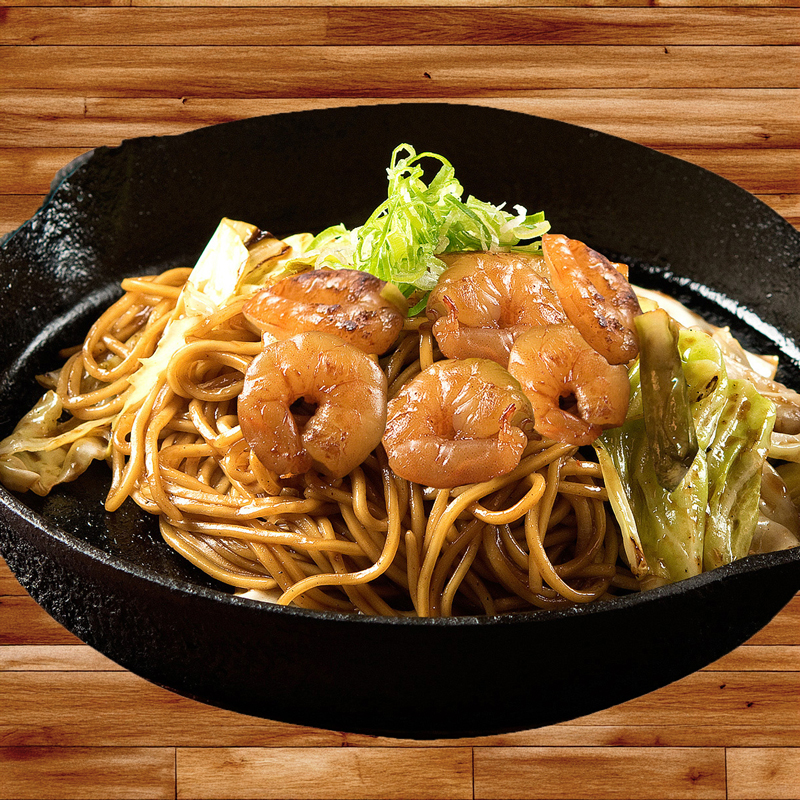 えびたっぷりの焼そばです。麺の量と太さ、たれの種類、トッピングは自由にお選びいただけます。